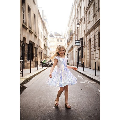 Encourage your young superstar's dreams of singing to sold out stadiums with the gift of this super sparkly dress. Covered in a mix of large and small iridescent sequins, the dress glows white at first glance, but reflects soft purples and rainbow hues as it moves - perfect for rising stars who love to shine. Short flutter sleeves add a playful touch while keeping it comfy for dancing, singing, and striking a pose just like Taylor Swift! This dazzling dress is sure to be your concert queen's new favorite outfit for pretend play, holiday parties, and even everyday trips to the toy store. Added perk: it's machine washable!