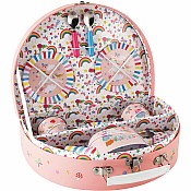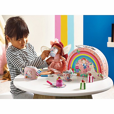 Here's the "tea": this rainbow fairy set is a magical pick for pretend play! Serve up memorable pretend play fun at picnics and tea parties with dolls, stuffies, friends, and family. The food-grade tin tea accessories include: 2 cups and saucers, 2 spoons, 2 plates and a lidded teapot - which all fit inside the carry case for storage.