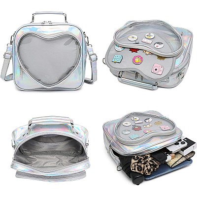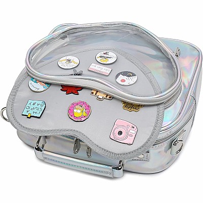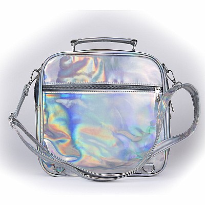 Fashionistas show off their style and their collectibles with this vibrant, holographic bag! Perfectly sized at 9.5" x 9" x 3", this zippered bag has adjustable straps so it can be worn as a backpack or crossbody style. The clear heart-shaped pocket in front can be filled with fidgets, miniatures, lip glosses, or other tiny treasures!