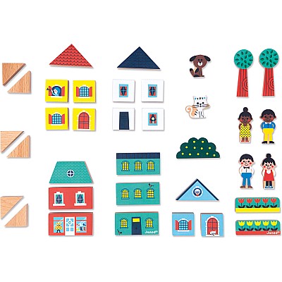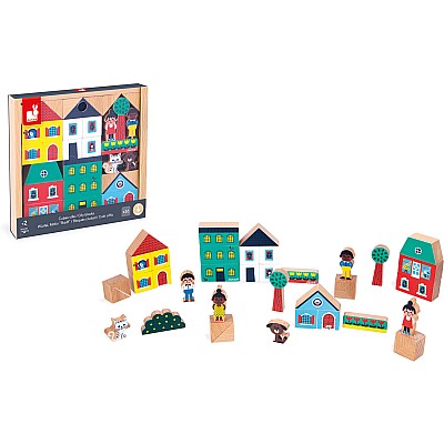 Welcome to the city, where storytelling adventures await on every corner! Encourage open-ended building with this gorgeous set of 36 wooden blocks: 25 cubes to assemble houses and buildings, 5 decorative elements, 4 people and 2 animals. Will they build a one- or two-story house? Colorful, pointed, or flat roof? Little learners develop their creativity, imagination and dexterity as they play. Combine with Janod City Play Mat for a gift that wows.