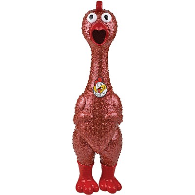 Why did the 24" rubber chicken cross the road? To get to your house! Kids and adults squawk for joy when they discover that this giant, sparkly gag gift makes a long, drawn out wail when squeezed. We promise it will be a huge hit: dress it up, bring it to tea parties, use it to make a point when someone isn't listening... there are so many reasons to love this eggs-traordinary pal! Available in many fun, sparkly colors (don't worry, the glitter is built in so it doesn't shed), each sold separately.