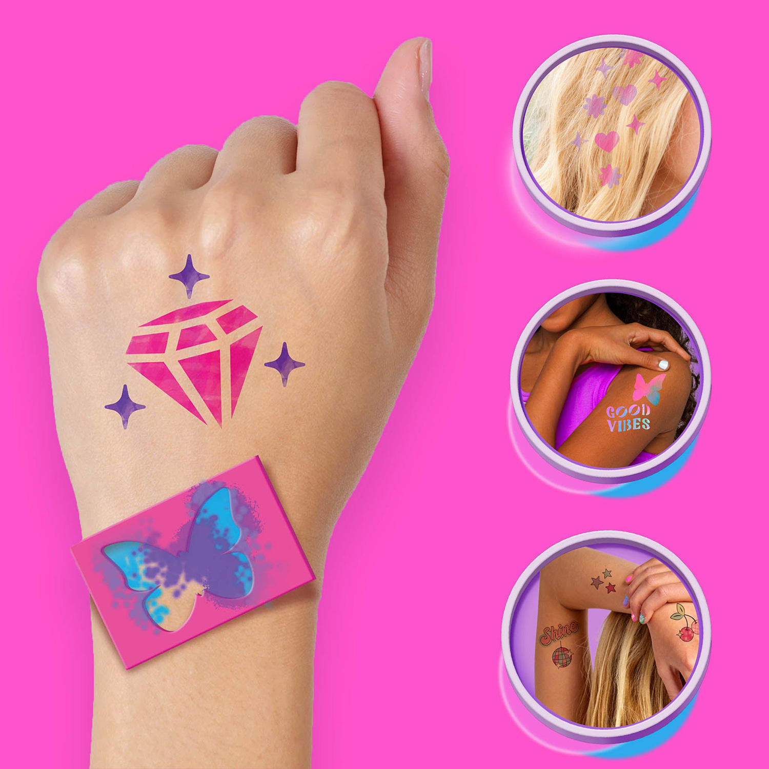 Empower kids to show their true colors with the GenMe All-in-One Airbrush Designer! This one-of-a-kind beauty set comes with a cordless, cosmetic-grade airbrush pen, allowing kiddos to create vibrant hair art or body art using reusable sticky stencils. Rock their world with a faux white hair extension for a stunning rainbow hair effect or fill up arms with washable designs that inspire good vibes! Includes 4 colors of airbrush markers and even some cute temporary tattoos. USB rechargeable, cable included.