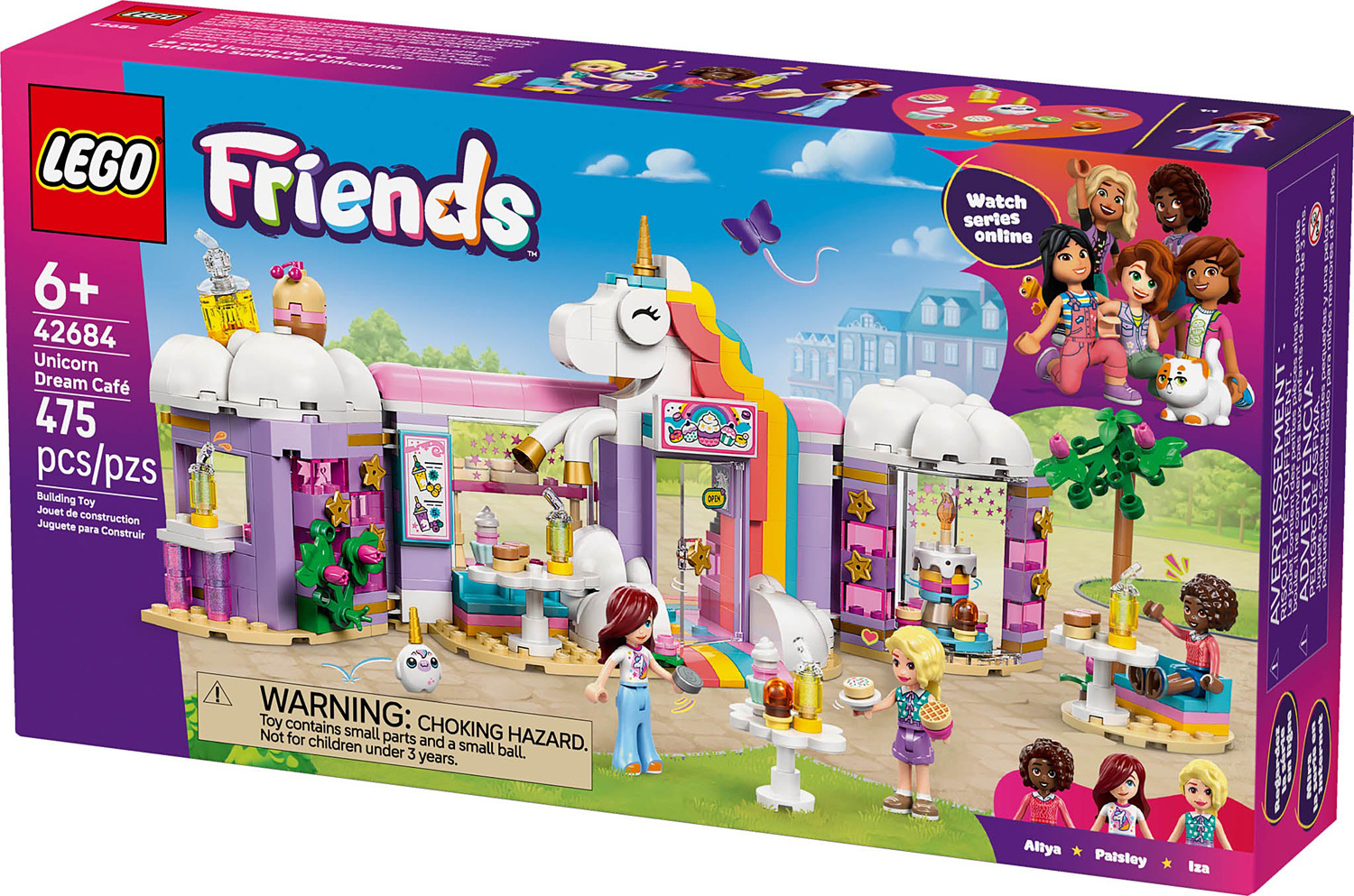 Grab your friends and get ready for hours of imaginative play adventures at the Unicorn Dream Cafe! Fantasy-loving kiddos will be wowed by this super detailed 475-piece build that's filled with fun features for creative play. As the minidolls walk through the door of the cloud-capped cafe, a friendly smiling unicorn greets them. Cafe owner Iza has displayed cupcakes in the cafe windows and on the turntables, and serves up juice drinks and milkshakes to customers Paisley and Aliya. With indoor and outdoor seating areas, the play possibilities are endless!