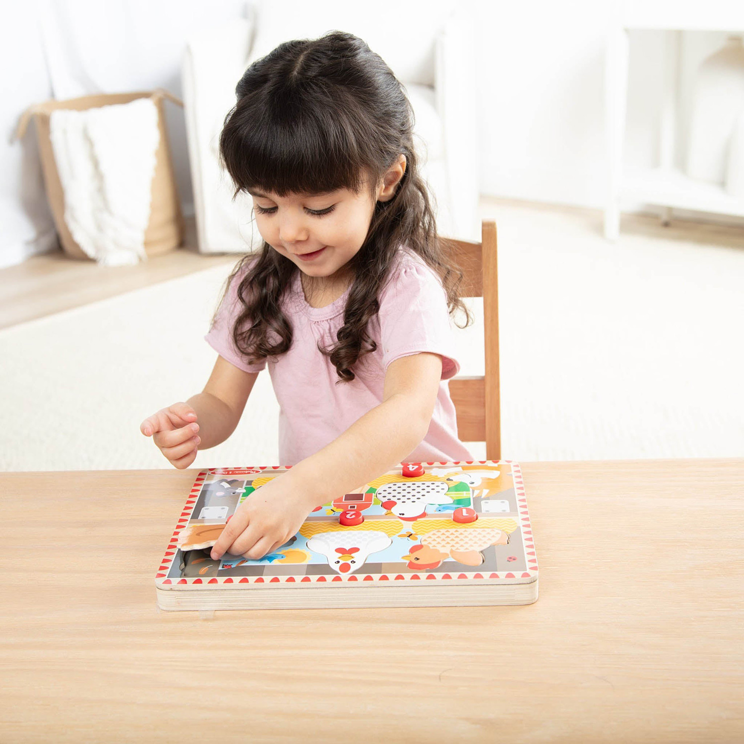 Toddlers press numbered buttons to pop chicken pieces out of the wooden puzzle; count the eggs underneath!