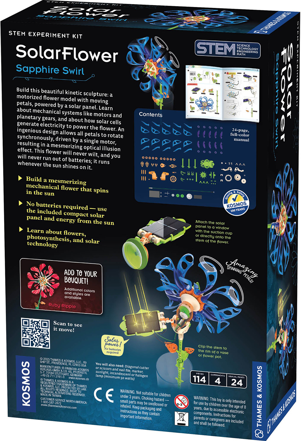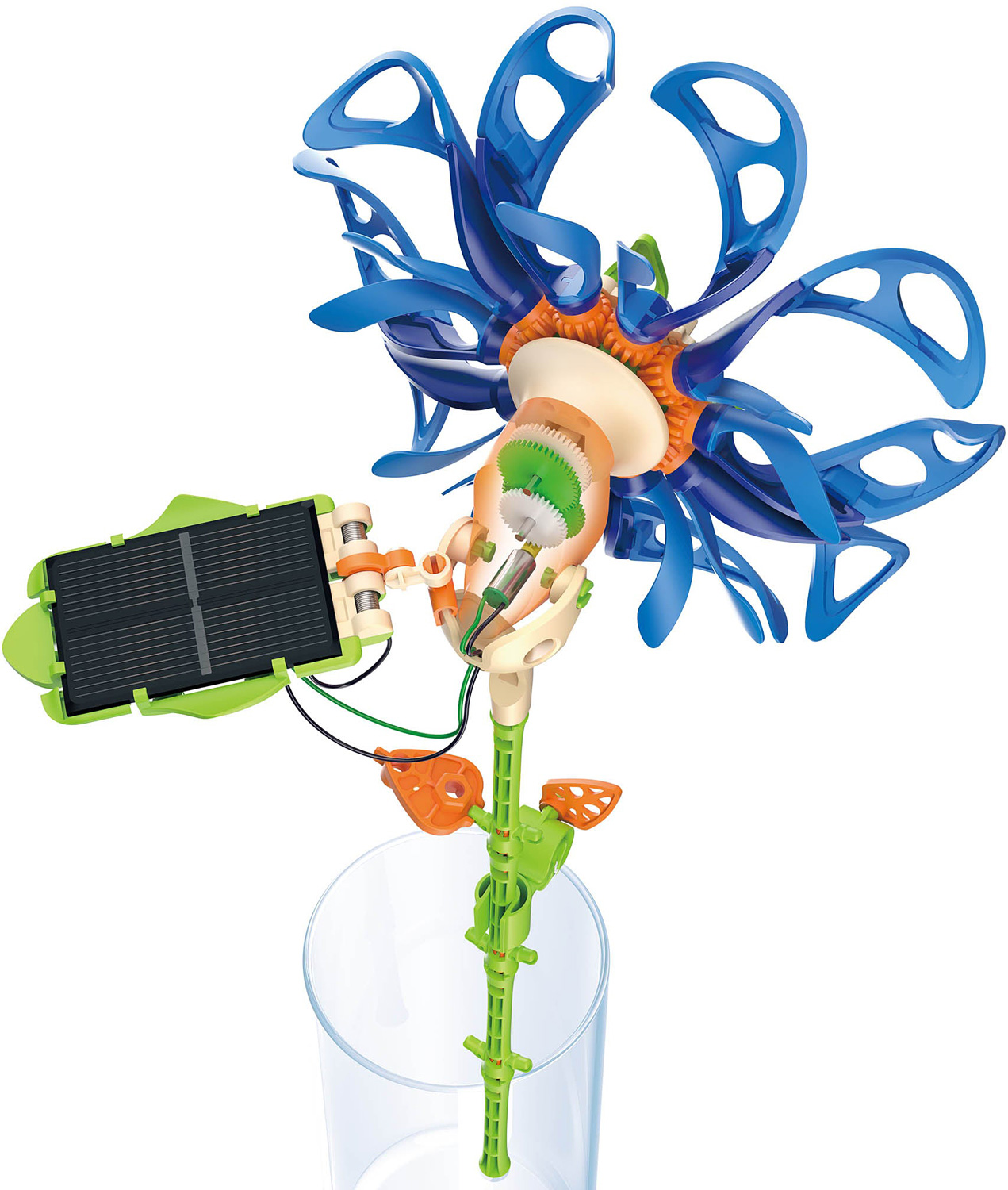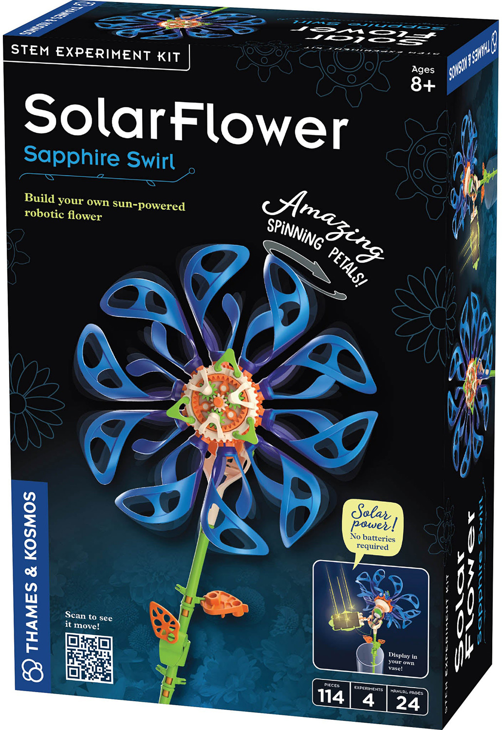 Celebrate Earth Day and the beauty of spring by building a gorgeous solar flower! This STEM kit guides ages 8+ through assembling a sapphire blue robotic flower with petals that swirl, powered by the sun. It's a soothing, hypnotic motion that calms the senses. Kids learn about gears and how solar cells create electricity to drive a motor. Makes a wonderful Mother's Day gift, and even has a clip for attaching inside a vase!