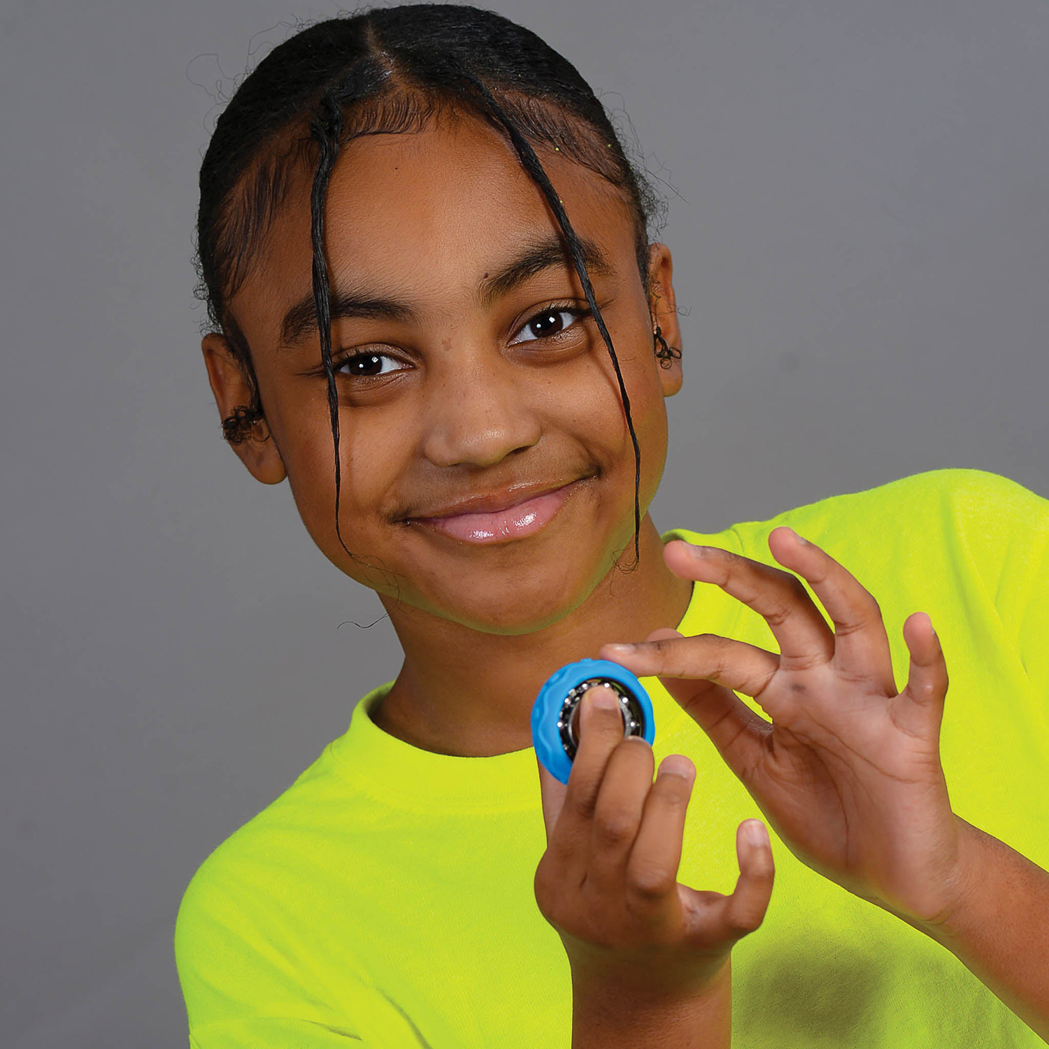 Take this super satisfying new fidget for a spin! Spinoff is a ball bearing fidget spinner with 3 interchangeable silicone tires. Each tire has a unique texture that appeals to sensory seekers. It's a perfect size to keep in a pocket or purse, and is quiet enough for focused fidgeting anywhere, any time! Colors vary.