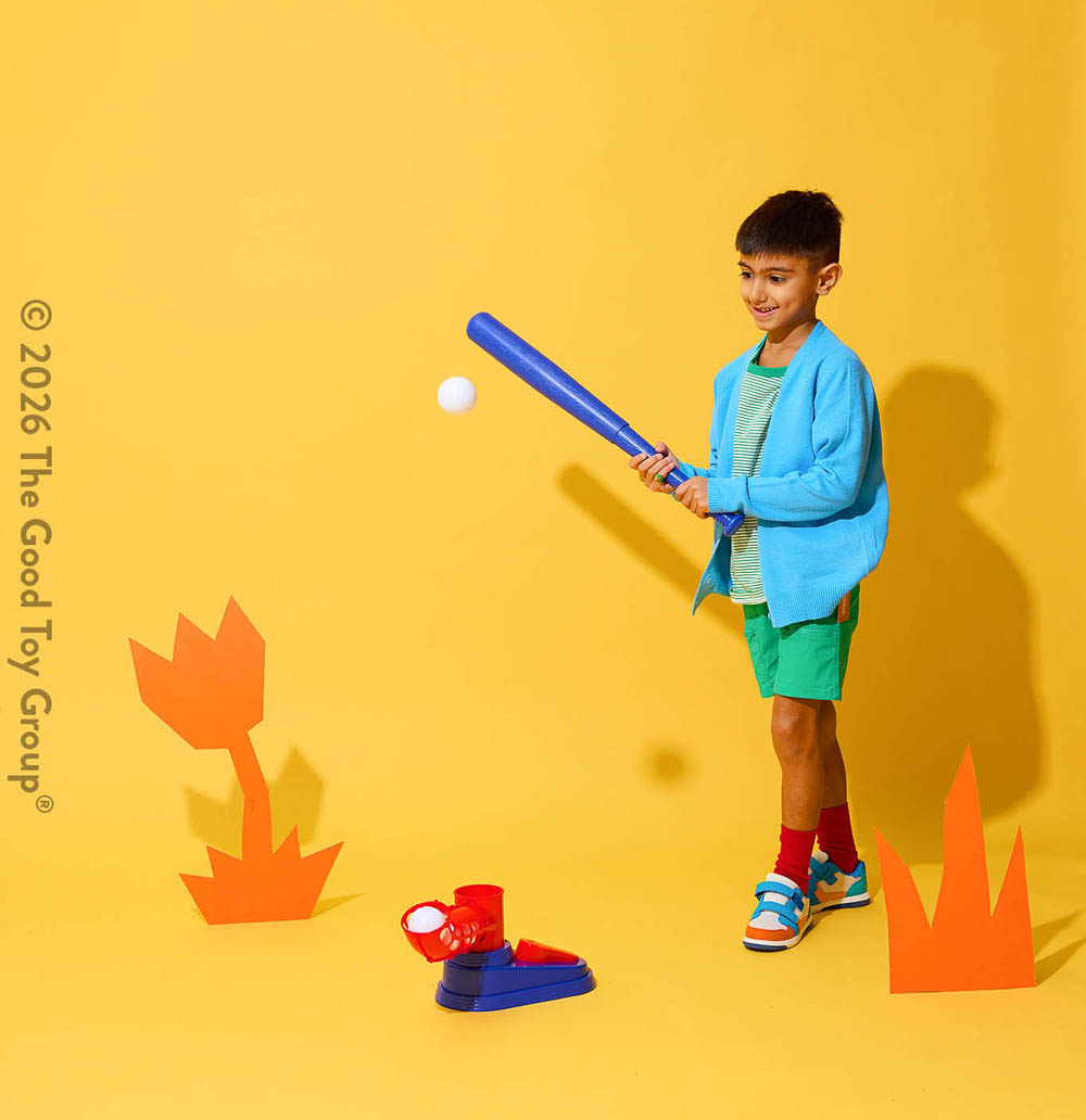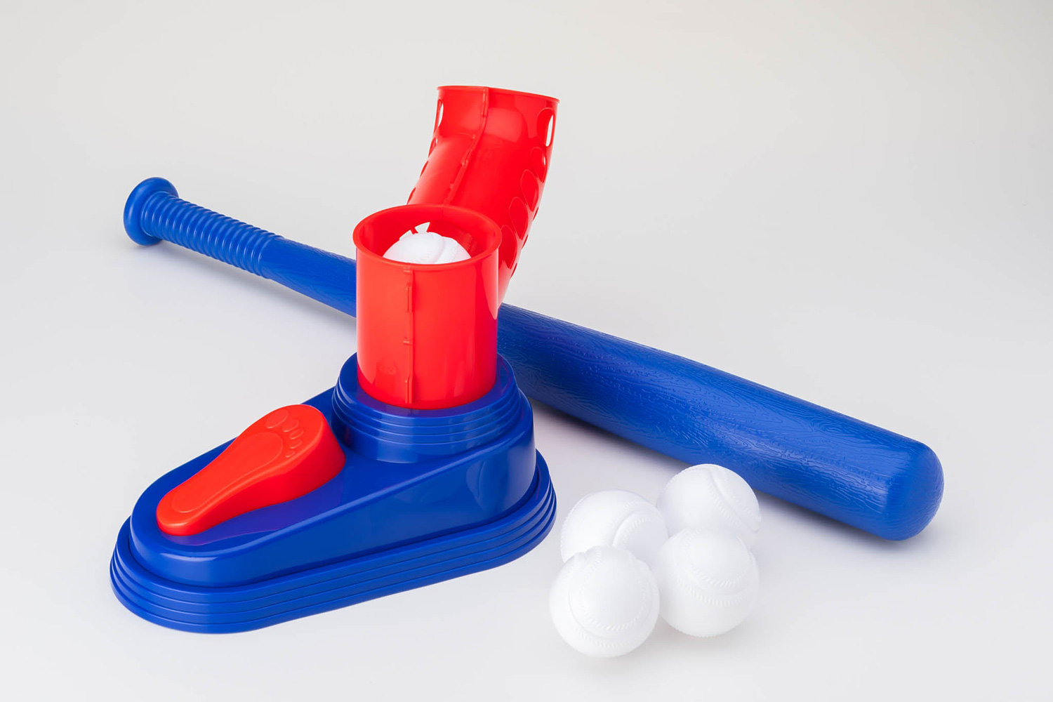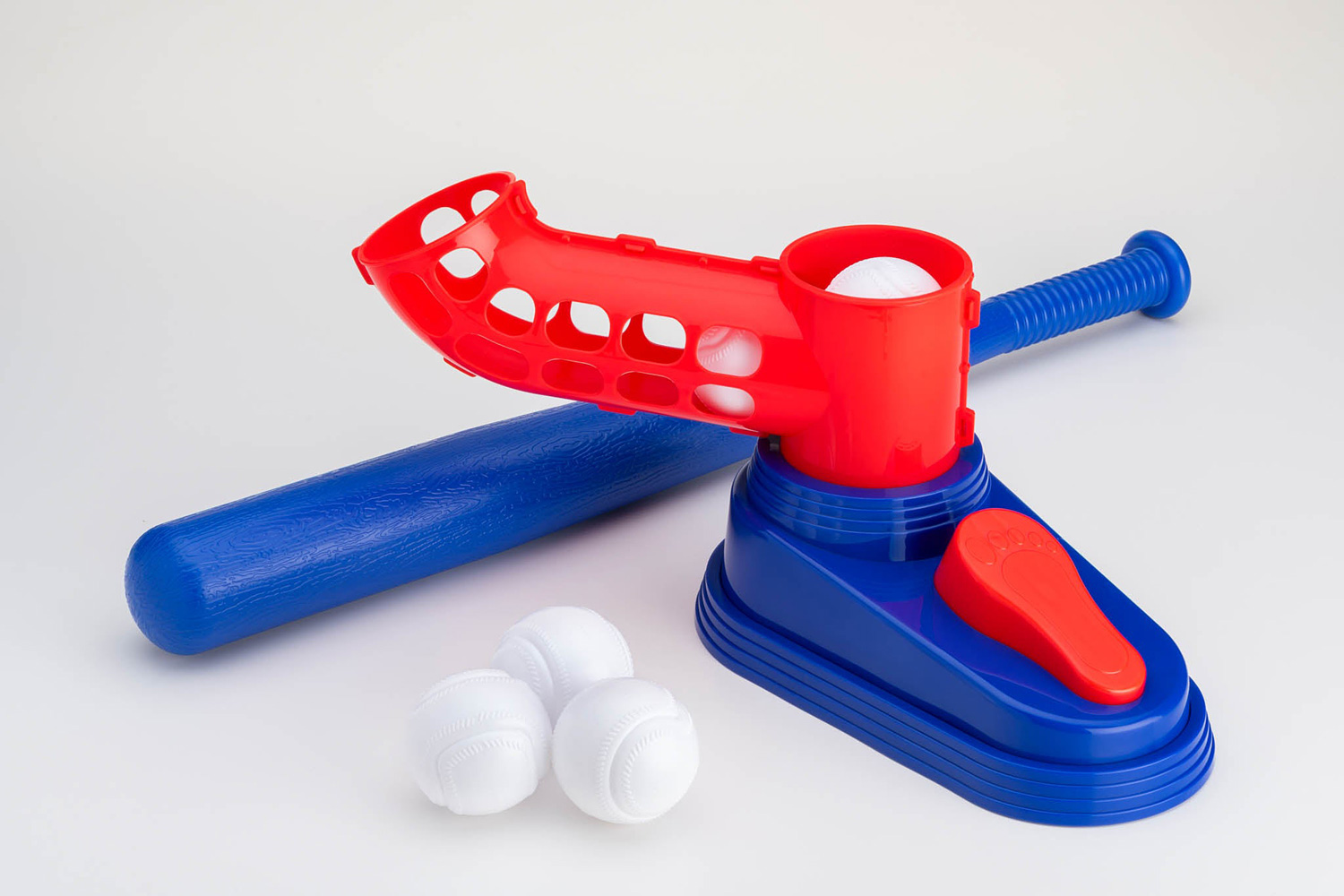 Stomp, swing, hit! Future all-stars get some independent batting practice using a battery-free baseball pitching machine. Designed for kids that are ready to graduate from tee ball and practice hitting a moving target, this durable set teaches hand-eye coordination and builds confidence. It's easy to use: kiddos stomp on the pedal, get a second to prep, and then swing at the ball as it pops up. Includes a ball launcher, collapsible plastic bat, and 5 durable plastic balls.