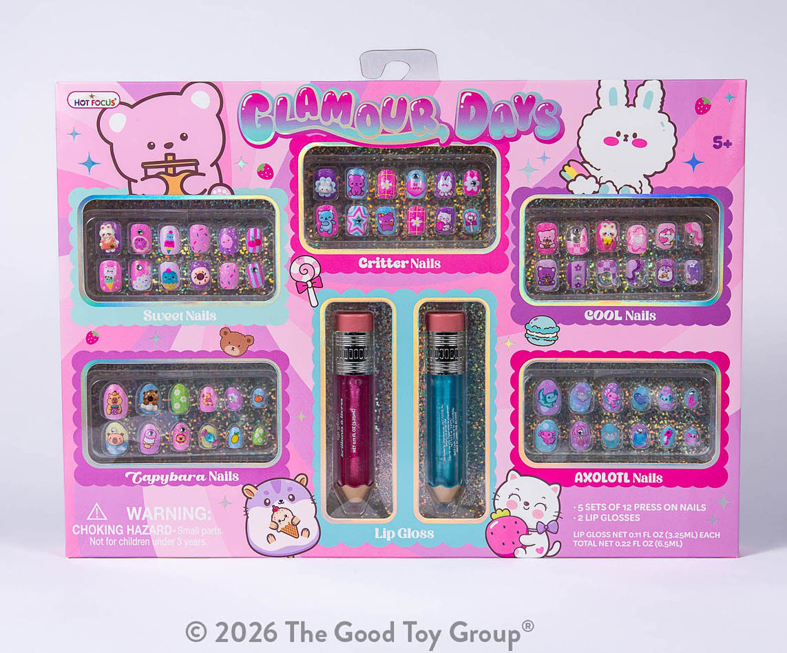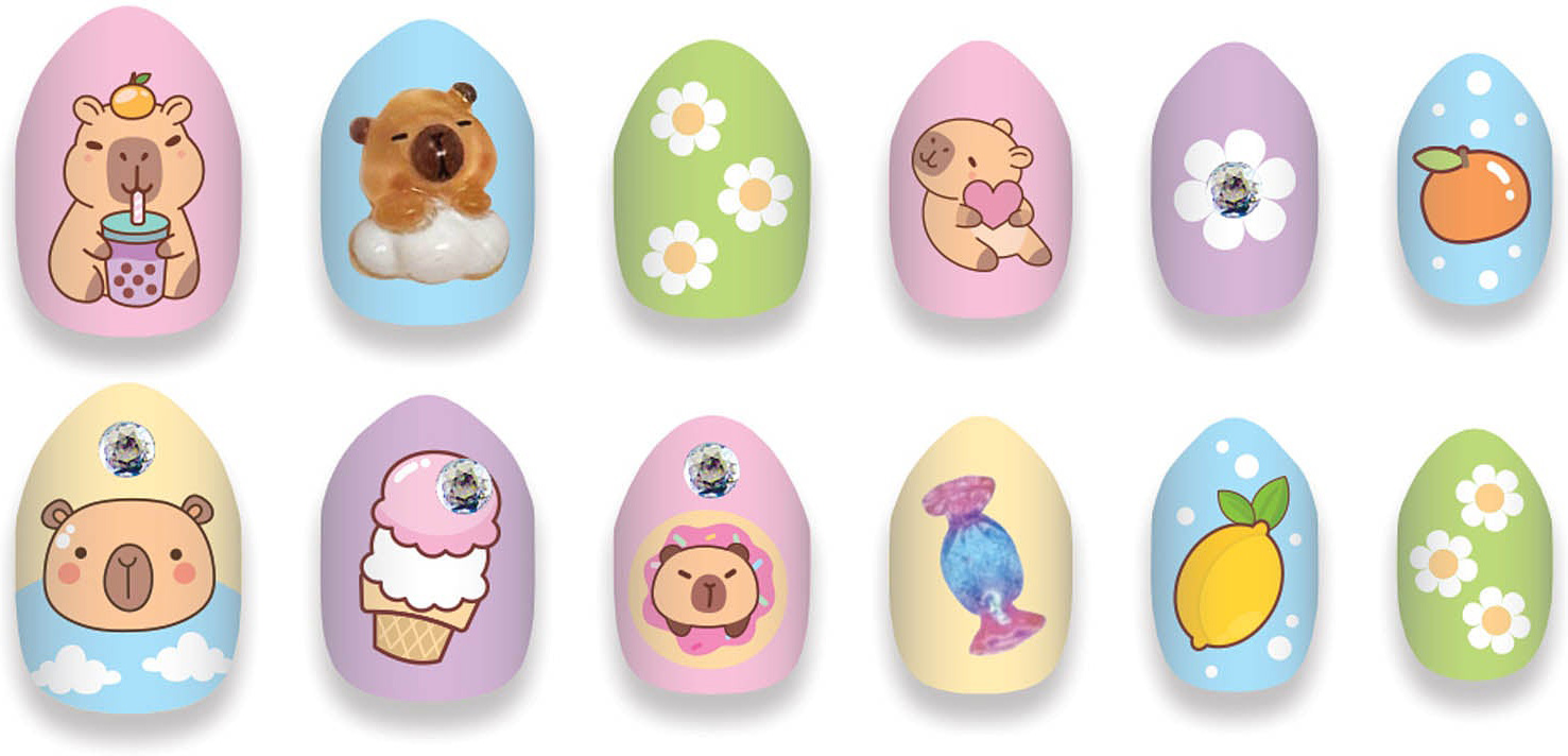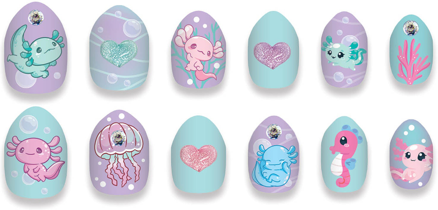 Skip the salon and create fun memories of getting glamorous manicures at home! With this all-in-one kit, glam girlies choose between 5 sets of 12 press-on nails with 3D designs: capybara, sweet, critter, cool, and axolotl. They're easy to apply, quick to remove, and look fabulous! This extremely giftable nail kit also comes with two lip glosses.